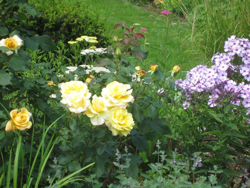 Für das schmale Beet geeignet sind evt. welche von den robusten neuen Teehybriden. In rosarot kann ich aus meinem Garten 'Charisma' empfehlen, in gelb 'Sunny Sky'. Die gelben sind oft etwas heikel, auch was die Frosthärte betrifft, Kombinationen von gelben und roten Rosen mag ich persönlich nicht so.