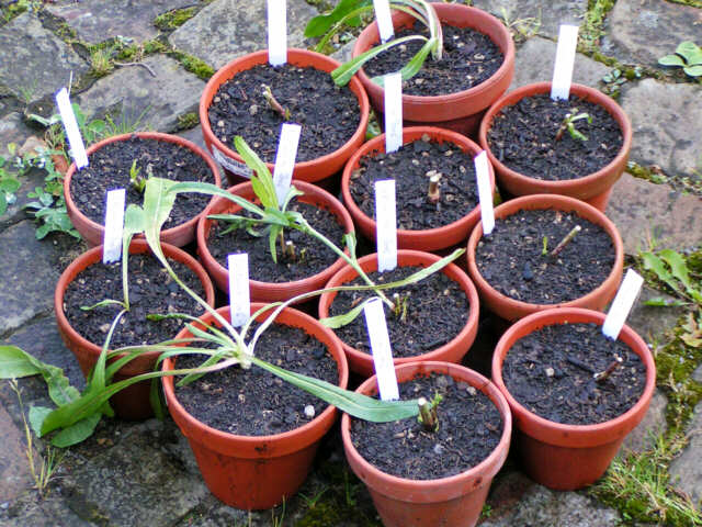 Das Brotmesser natürlich zum Zerteilen des sehr dichten Wurzelballens. Die üppig geblüht habende Wegwarte stand nämlich in einem 24er Tontopf. Nachdem ich durch die Faserwurzeln hindurch auf die Pfahlwurzel vorgedrungen war, fand ich ein unterirdisch ebenso buntes Bild wie oberirdisch: lauter kleine Brutpflänzchen in den unterschiedlichsten Größen an den Wurzelpfählen der fast abgeblühten Wegwartentriebe. So konnte ich aus dem einen großen Topf 12 kleine Töpfe zaubern, die größtenteils Pflanzen beinhalten, die im nächsten Jahr von Anfang an mehrtriebig sein werden und höchstwahrscheinlich noch im gleichen Jahr blühen. Die Alttriebe sind auf 1 bis 2 cm eingekürzt.Die Ausgangspflanze hatte ich mir im vergangenen Jahr am Mittellandkanal ausgebuddelt, unten- und obenrum radikalst eingekürzt und in einen 11er Tontopf gepflanzt. Ende September hatte sie bereits gut ausgetrieben. Im Frühjahr dieses Jahres war wegen des bereits vollständig geschlossenen Wurzelballens zweimaliges Umtopfen erforderlich, und im Juli noch einmal, in eben den 24er Topf, immer Ton.Die Leutchen hier, denen ich eine Wegwarte versprochen habe, warten am besten bis zum Frühjahr. Ich versende dann frisch ausgetriebene Pflanzen mit dichtem Wurzelballen. Oder vor`m Winter, Anfang Dezember.