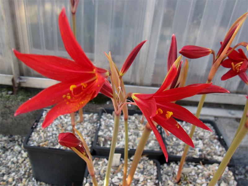 Rhodophiala sind wirklich reizende Geophyten, die ein wenig wie Miniatur-Hippeastrum aussehen. Ergänzend zu den Informationen, die unter den Links in Zwiebeltoms Post gegeben werden, möchte ich erwähnen, dass man bei all diesen Amaryllidaceen auf die Narzissenfliege achten sollte, wenn man die Töpfe mit ihrem meist mit recht durchlässigem Substrat zeitweise im Freiland aufstellt.