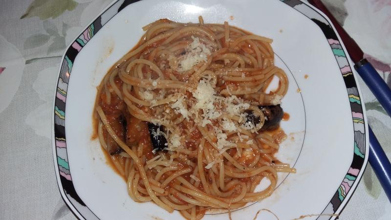 Montag : Eins meiner Lieblingsessen, Spaghetti mit Auberginen-Sardellen-Tomatensauce mit Mozzarella und Pecorino :D