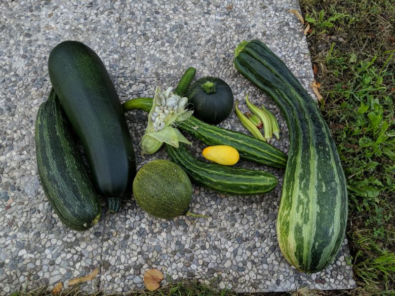 Ein paar Zucchini, Gurken, Okra, Melone und Maisbeulenbrand.