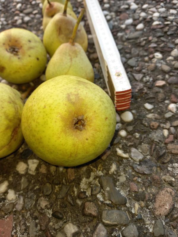 Hallo, ich habe heuer eine kleine Streuobstwiese gegönnt. Dort stehen drei Birnenbäume. Die Sorte des größten Baums würde ich nun gerne mit euch bestimmen. Wir haben heuer hier ein Birnenjahr. Dieser große Birnenbaum ist über 60 Jahre alt. Momentan fallen die ersten Birnen runter. Vor dem Hintergrund, dass wir hier in einer raueren Gegend leben, würde die Reife bei manchen Purlern 2, 3 Wochen früher sein. Hier ein Bild von den ersten Birnen. Bilder von heute.