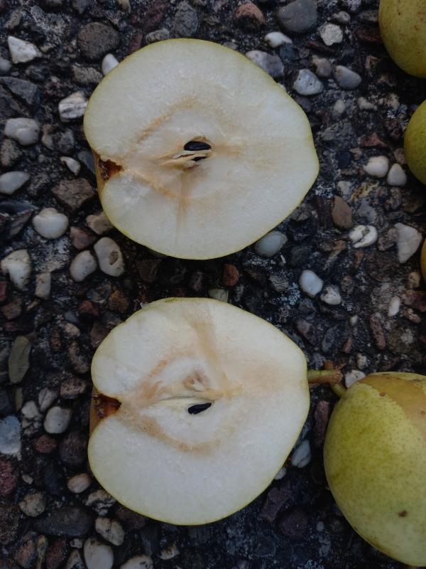 Disese sind noch etwas kleiner, am Baum sind noch deutlich größere. Fruchtfleisch ist zart, keine bis sehr wenige Steinzellen, wirkt noch leicht adstringierend. Es wirkt so, als würden sie halbschmelzend werden. Süß, keine Säure bemerkbar leicht aromatisch (typisch Birne). Die Früchte die ich geerntet habe, scheinen alle samenlos zu sein. Kernhaus ist sehr klein und sehr hart. Kernhaus ist schwer zu durchsneiden. Kelchhöhle scheint bis zur Kernhaus zu reichen. Kelch ist offen