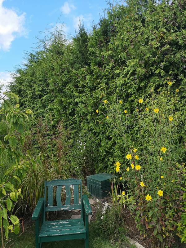 Unser Nachbar hat auch eine Thujahecke an der Grenze zu uns. Als wir eine Garage gebaut haben, musste die Hecke auf dieser Länge weichen. Die beiden entstandenen "Endstücke" waren natürlich braun und kahl und ich hatte ein schlechtes Gewissen. Die kahlen Flanken sind wieder dicht und grün zugewachsen, allerdings gab es zu jener Zeit auch noch Regen.