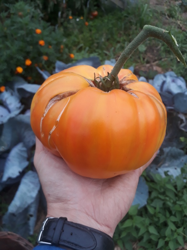 die erste Frucht an einer S.habrochaites x domestic Kreuzung wird reif. Es ist jetzt F3. Alle Pflanzen sehen anders aus. Letztes Jahr waren es noch kleine grüne Murmeln. Es wird spannend, ob sie auch schmeckt...