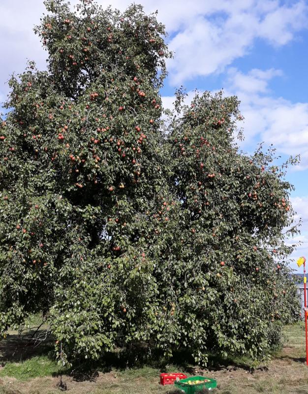 Hier erst einmal ein Gesamtbaumbild. Rechts erkennt man am Obsternter eine Hand, so dass man das Größenverhältnis erkennen kann. Der Baum ist... sehr groß. Vom Vater einer älteren Dame... tja und da hakt es jetzt gepflanzt als Sämling oder gepfropft. Das Wissen ist weg.