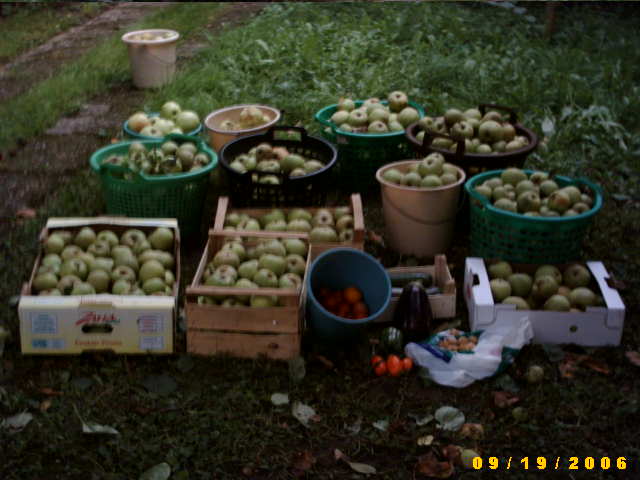 Das war unsere gestrige Ernte, hauptsächlich Äpfel von einem riesigen alten Boskoopbaum. Das andere kann man leider schlecht erkennen, es sind Zucchini, Tomaten, Auberginen, Physalis und ein paar Bohnen.