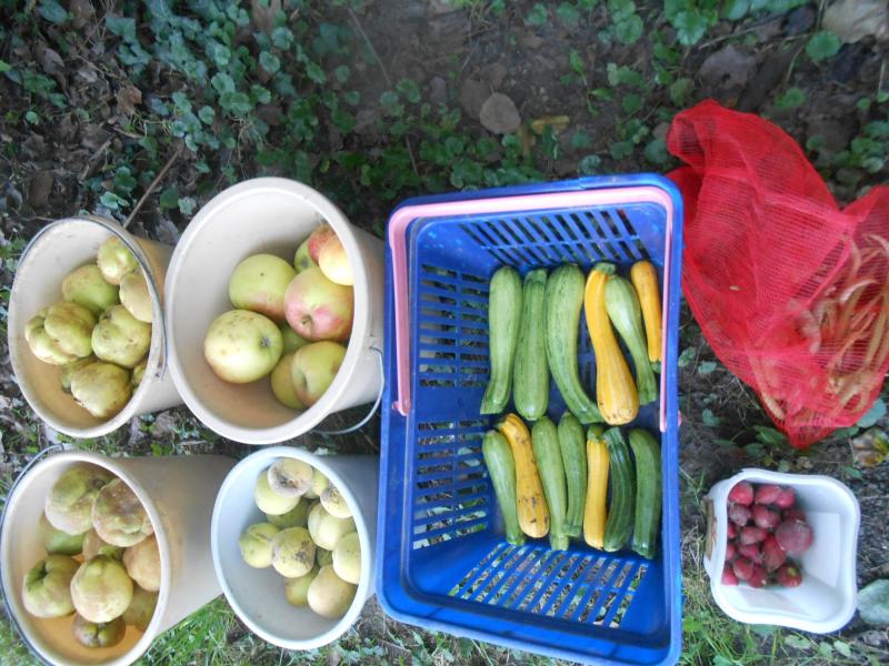 Am vergangenen Mittwoch habe ich das auf dem Bild geerntet. Gestern meine Tochter, ohne Foto: Wieder viele Zucchini, 2 Eimer Quitten, 2 kleine Eimer Pfirsiche, einige Karotten, ein paar Radieschen. Ich bin nur noch am verarbeiten und austeilen ::).