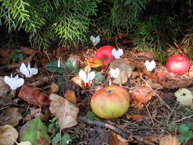 "Roter Trierer Weinapfel" neben Cyclamen hederifolium album unter hundsgemeiner Thuja "Smaragd"