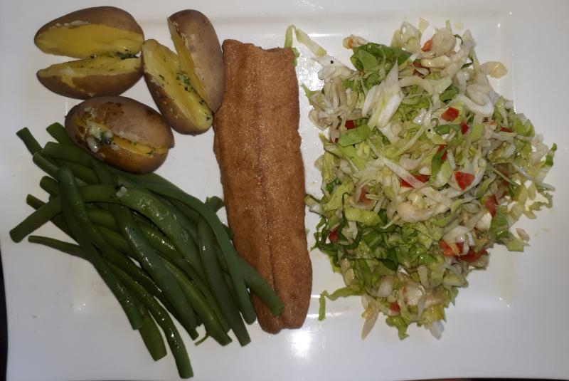 Bratgering, Pellkartoffeln mit Kräuterbutter, grüne Bohnen und Zuckerhut mit Tomaten