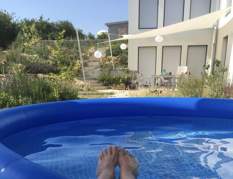 Wo die Füße sind, ist übrigens Süden, und links Westen. Ehrlicherweise ist es im Hochsommer nachmittags zu heiß, was aber an der geschützten Lage durch die L- Form des Hauses liegt. Zu allen anderen Tages- und Jahreszeiten ist das natürlich perfekt :)
