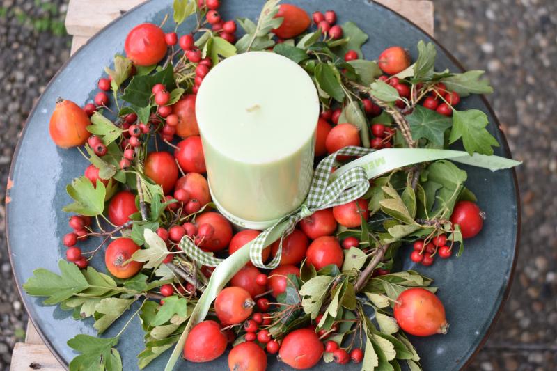 Hier habe ich die Zieräpfelchen zum Weißdornkranz dekoriert, vermutlich diesselbe Sorte.