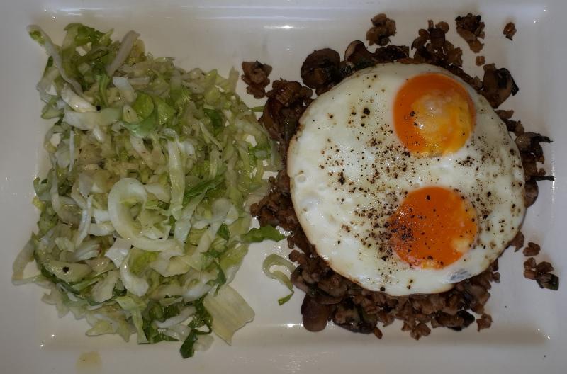 Dinkelpdanne mit Champignons und Porree, Spiegelei und Zuckerhut