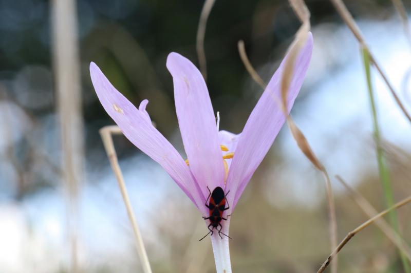 Aber auch die Feuerwanzen schätzten die Herbstzeitlosen nach einem nächtlichen Regen als trockenes Plätzchen an einem Naturstandort.