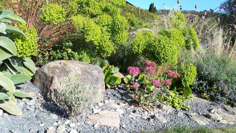 Zum Ende des Rundganges strahlt das Westbeet morgens angenehme Kühle aus und leuchtet dunkel mit Edelsteinfarben. :)