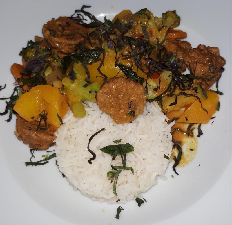 Gemüsecurry (Brokkoli, Möhren, Tomate, Zucchini, Paprika, Zwiebeln), vegetarische Bällchen (waren absolut überflüssig), Basmati und Feldsalat