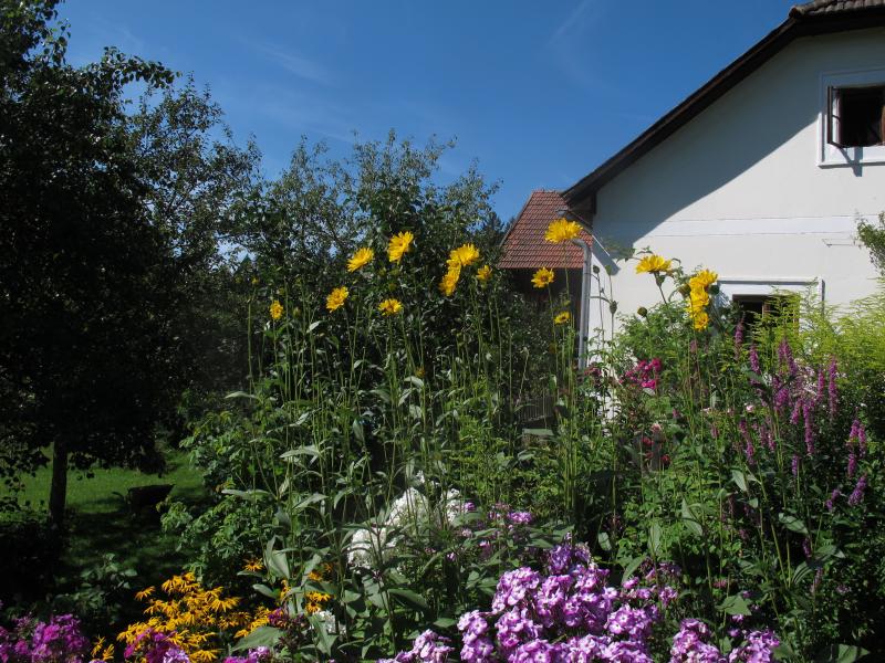 Fröhlich hat mich mein Garten heuer sowieso gemacht - wir hatten so viel Regen, daß alles, zusammen mit einer großzügigen Kuhmistgabe letzten Herbst, höher und größer geworden ist als sonst. Besonders die gelben Blumen, die der lerchenzorn schon mal identifiziert hatte (hab den Namen nicht gleich notiert :-[ ) und die irgendwie unmotiviert das Phloxbeet teilen. Eigentlich hatte ich sie woanders hingesetzt, dort sind sie verschwunden und rätselhafterweise hier wieder aufgetaucht. Ich schätze sie auf mind. 2,5 m :-\