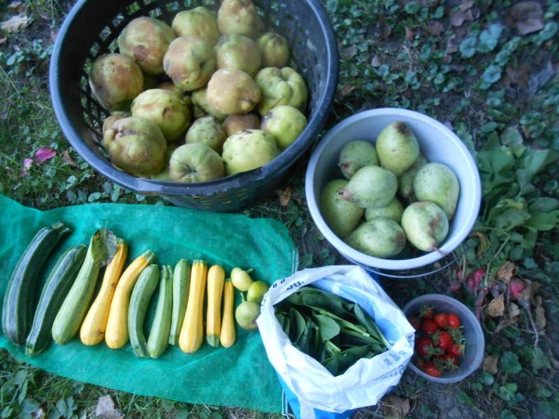 Dies ist meine Ernte von vorgestern. Die Birnen sind Gräfin von Paris, die Quitten sehen etwas grüner aus als sie sind, in der Tüte ist Spinat.