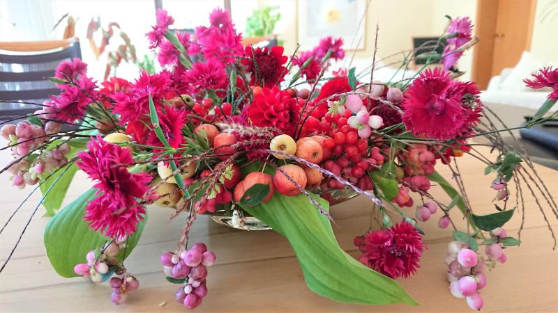 Verschiedene Zieräpfel, "Knallerbsen", Pfaffenhütchen, letzte Dahlien und Chinesernelken, die nach dem sommerlichen Rückschnitt zum zweiten Mal blühen.