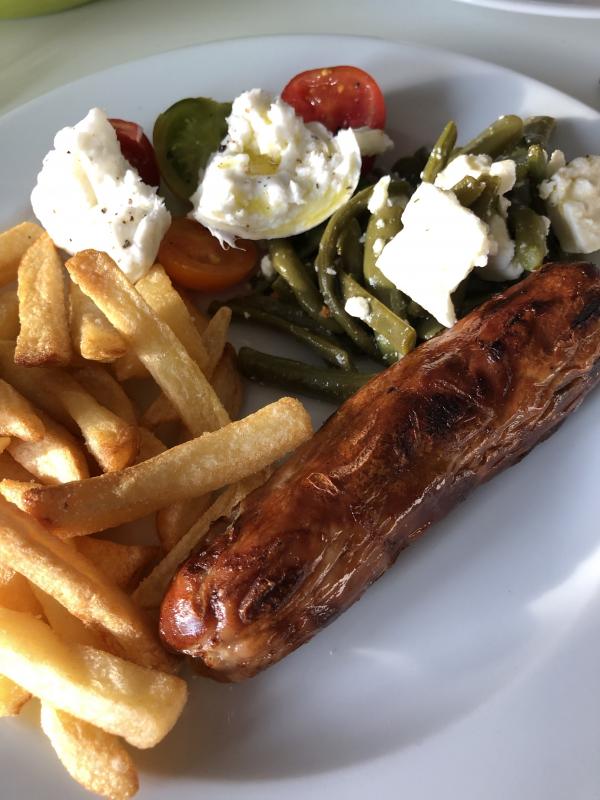 Wir hatten gestern Bratwurst vom Grill, Pommes, Bohnensalat mit Schafskäse und Tomate-Mozzarella