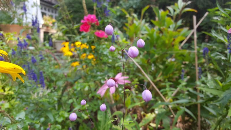 Thalictrum delavayi " Splendid ", in einem anderen Beet -- hier noch die obenerwähnten Ballons etwas näher