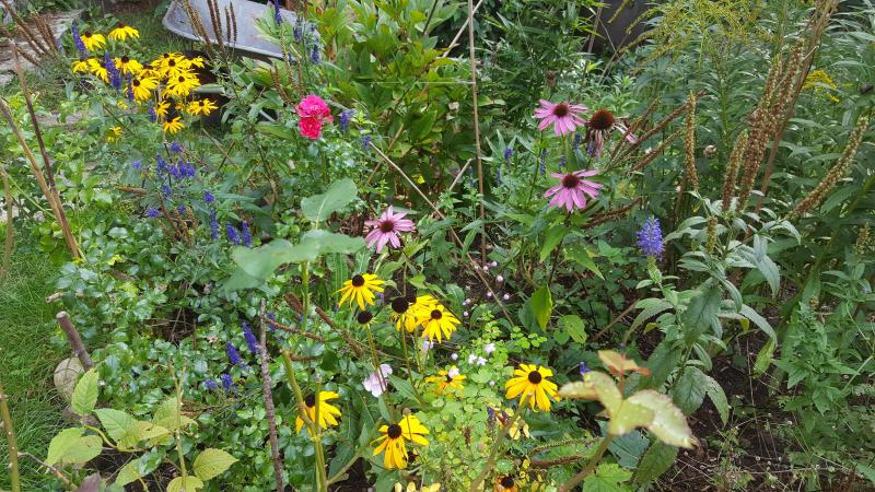 .... und Veronica " Dark Mätje " in Zweitblüte, unbekante Rose , Echinacea " Magnus ", Goldsturmrudbeckie, und noch ein paar Thalictrumballons dazwischen