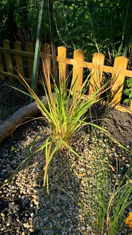 Sonst hätte icb auch an Panicum Shenandoah gedacht. Ich hab weiters an eine schmalen Streifen am Weg Blutgras gepflanzt. Es braucht aber ezwas feuchter.