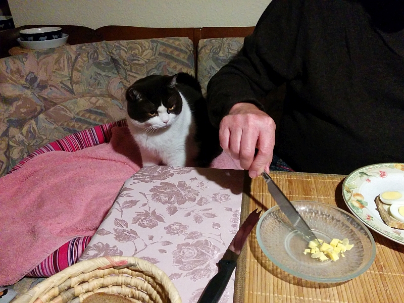 Wie Brezel schrieb, will auch Yvo meist wirklich nur Aufmerksamkeit. Als ich allerdings das Foto schoss, gab es gerade Stulle mit hartgekochtem Ei und Eigelb liebt er ;D. Er hat auch etwas bekommen. Sie wissen aber schon, dass sie von unserem Essen nichts abkriegen und betteln auch nicht. Ei ist die einzige Ausnahme ;D.