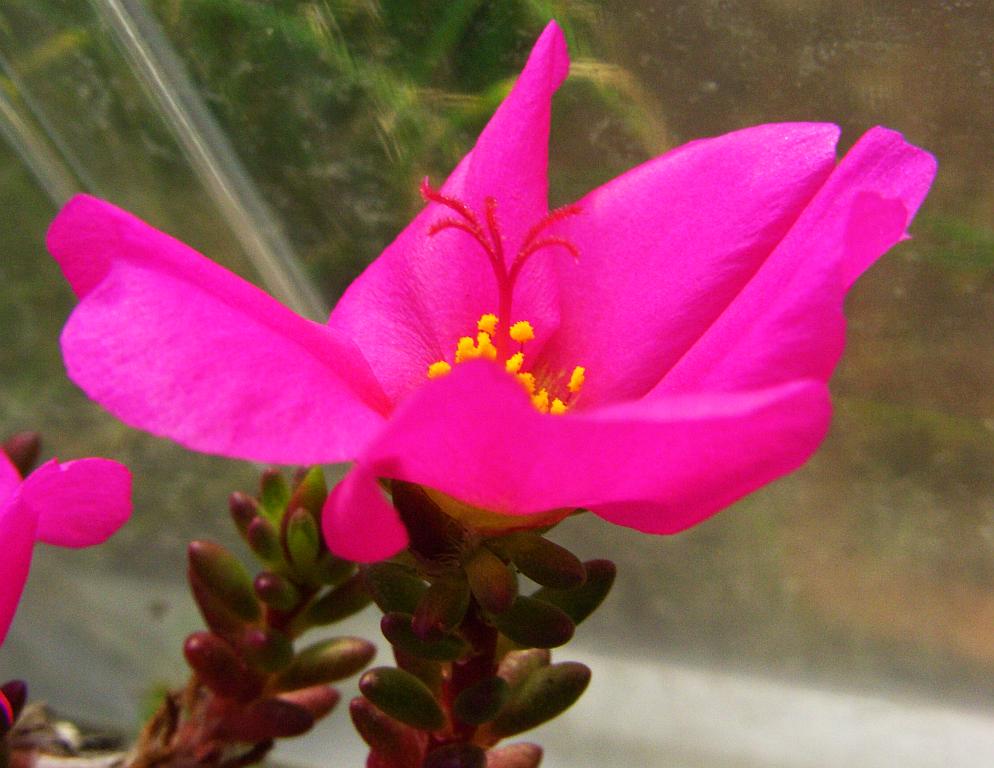 Einige Vertreter der Portulakgewächse Portulacaceae halten sich im Gewächshaus durch Aussaat auch ohne unser Zutun. Hierzu gehören Talinum, Calandrinia und auch Portulaca selbst, die auf diesen Bild zu sehen ist.