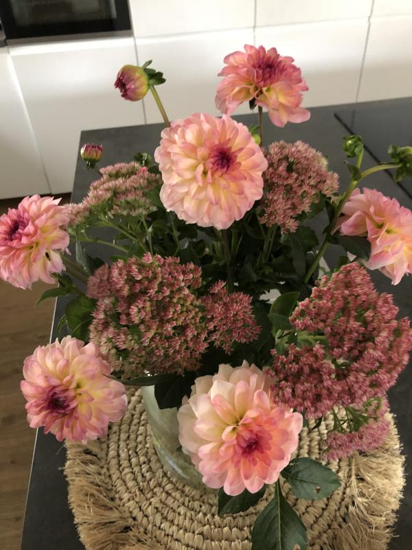 Ich hab gerade Dahlien von Wochenmarkt und Fetthenne aus dem Garten zusammen gesteckt...die Farben!!! :D