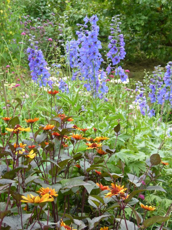 Ipomoea lobata, Nicotiana alata, Rudbeckia tripartita vermitteln noch Üppigkeit im Herbst.