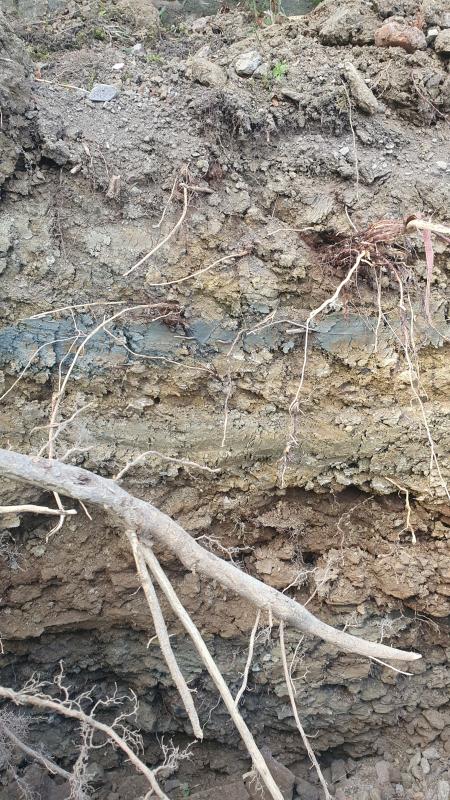 Unterhalb der blaugrauen Tonschicht (?) sind einige Pflanzenwurzeln zu sehen, also kommen Wurzeln durch.