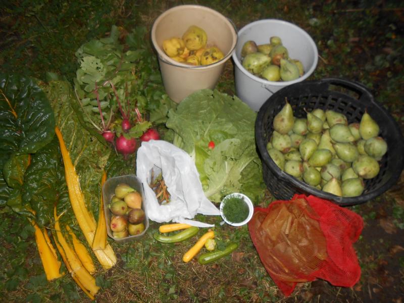 Hier ein kleiner Teil unserer gestrigen Ernte, mal wieder ein übersehener Riesenzucchino. Außerdem gab es noch Hirschhornwegerich, Asiasalat, Radieschen, einige Feigen und Mangold.