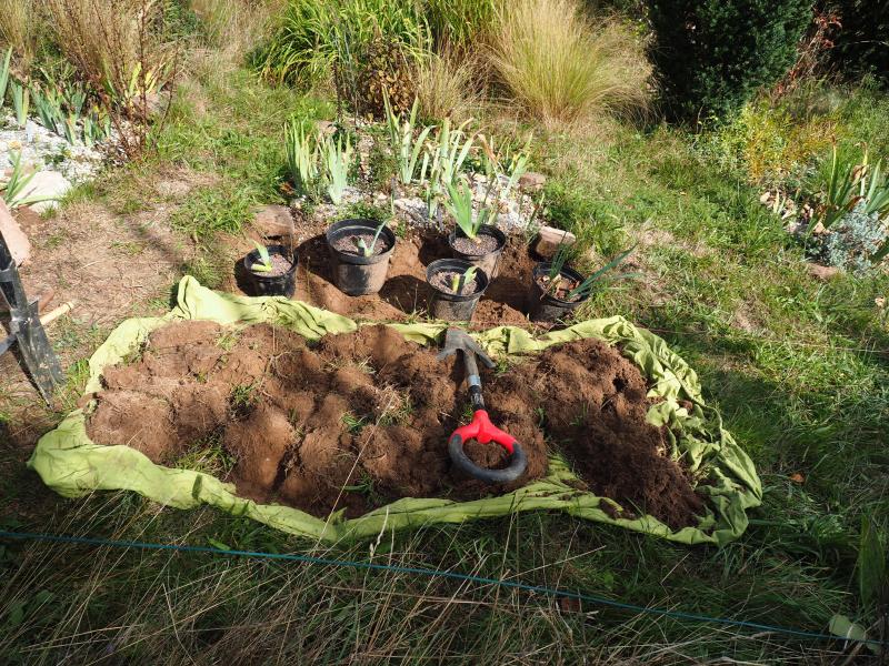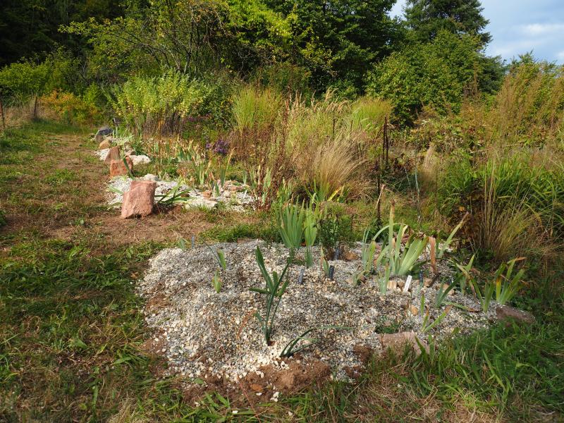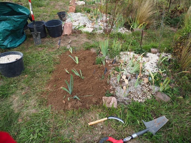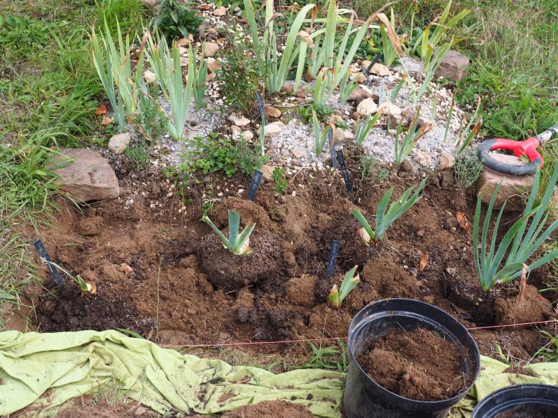 die Iris werden platziert - übrigens ist der ganze Ablauf jetzt nach dem Regen bei milden Temperaturen sehr viel flotter als noch letzte Woche in der Hitze und Trockenheit.