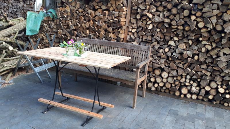 Hübscher Sitzplatz in der Holzecke, links lugt schon noch etwas Holunder hervor, muss ich noch klein sägen