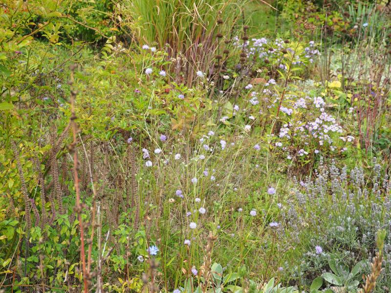 die hellblaue Aster im Hintergrund und der Teufelsabbiss aus Südfrankreich haben ein ähnliches Blau, was man nicht sieht. Aber Succisa pratensis sieht man im Vordergrund gut. Sehr hoch schwebende Bälle. Kamen gut durch die Trockenheit an diesem Standort und wie im Süden Frankreichs nahe der Küste reicht ihnen die Nässe und Feuchtigkeit des Winters. Eine typisch wechselfeuchte Pflanze mit mediterraner Verbreitung. Wikipedia.
