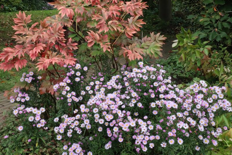 Hier habe ich die Aster 'Nachtauge' nur schlicht mit Gräsern wie Calamagrostis brachytricha und Pennisetum kombiniert. (Sept. 2019) Daneben steht dann der Callicarpa mit den leuchtenden Beeren. . . .