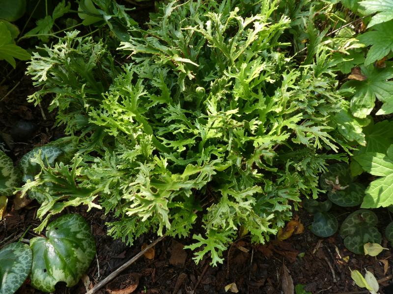Asplenium scolopendrium 'Furcatum'. Der hält sich sehr tapfer im Nichtschatten, der im Juli 2019 plötzlich entstand.