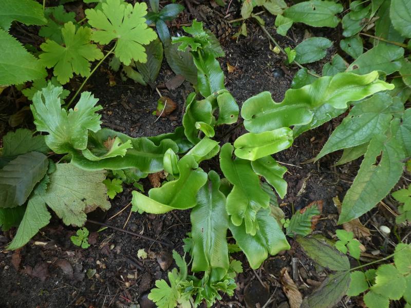 Asplenium scolopendrium 'Furcatum'. Der hält sich sehr tapfer im Nichtschatten, der im Juli 2019 plötzlich entstand.