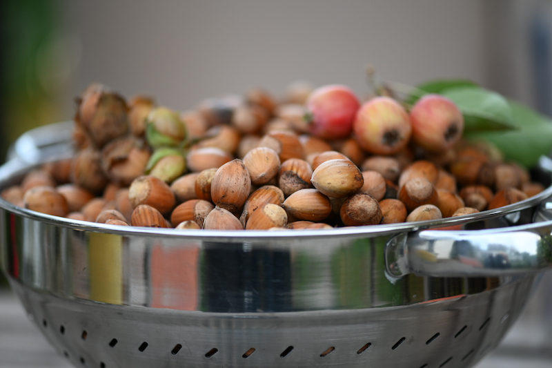 Meine Korkenzieherhasel, ich habe ein wurzelechtes Exemplar, das mir eine ehemalige Arbeitskollegin geschenkt hat, ist diesen Herbst völlig verrückt. Normalerweise liegt da eine Handvoll Nüsse darunter, aber vor ein paar Tagen habe ich einen ganzen Seiher voll aufgelesen. Als Größenvergleich ein paar Äpfelchen von "Evereste"