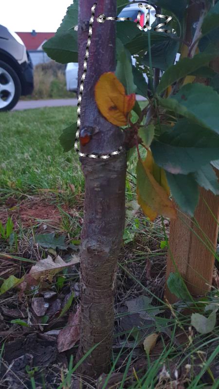 Was ist an dem jungen Stamm ungewöhnlich? Dass ein Kirschbaum etwas Gummifluss hat, ist nicht ungewöhnlich. Was seht Ihr da noch?