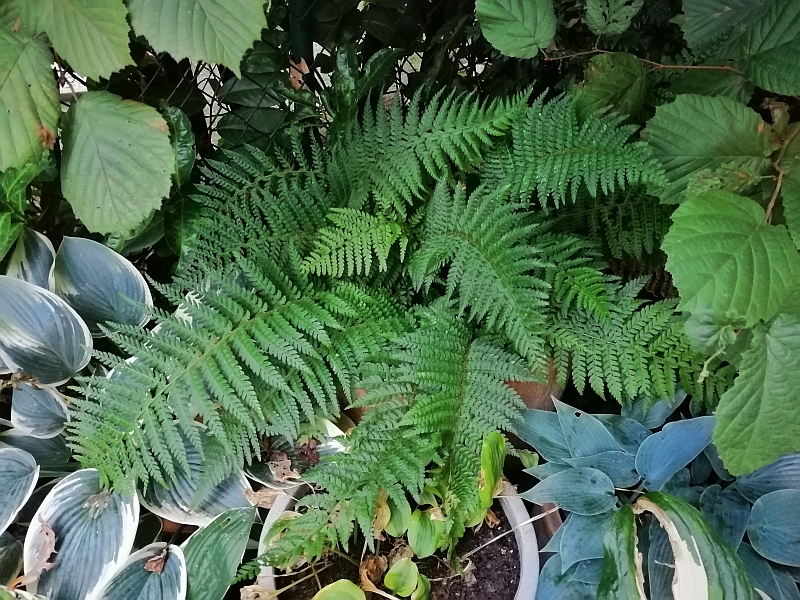 Ich hänge noch das Foto des bereits erwähnten Polystichum setiferum im Topf an. Mangels Pflanzplatz hatte ich ihn voriges Jahr nach dem Kauf einige Monate lang in seinem Originaltopf verbleibend geparkt, was ihm beinah den Garaus gemacht hätte. Ich bemerkte es gerade noch rechtzeitig. Nachdem ich ihn in den großen Tontopf umsetzte, erholte er sich innerhalb kürzester Zeit.
