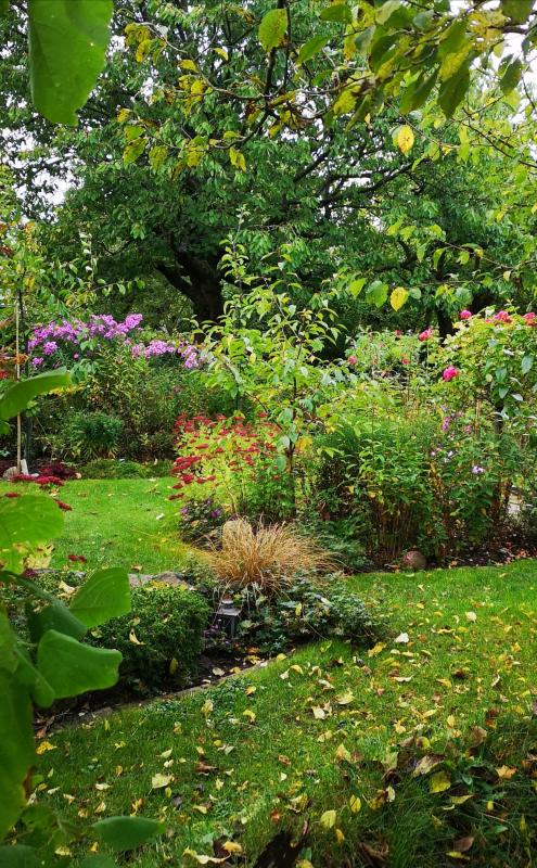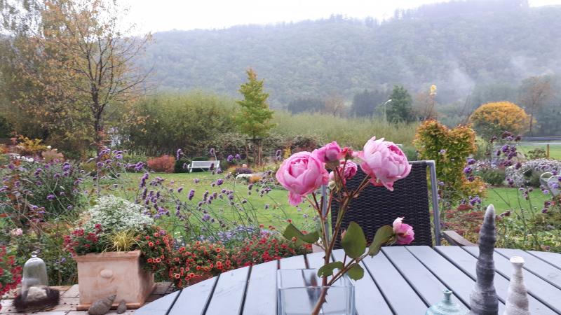 Hier bei uns seit Tagen Dauerregen... Hoffentlich liegen bei den Wassermassen nicht alle Blätter am Boden, bevor sie überhaupt färben konnten. :-\ Ich zeige daher heute meine Herbstimpressionen aus sicherem Standort von der überdachten Terrasse aus. :P