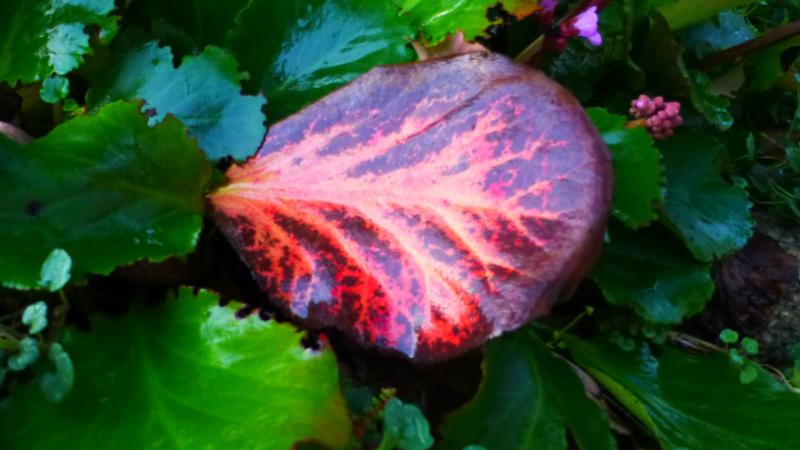 Bei uns fängt eine Bergenie an ihre Herbstfärbung anzulegen.