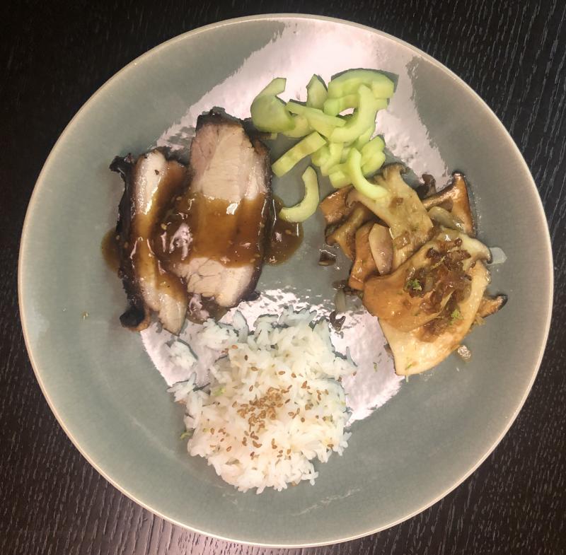 Bei uns gab es Moo Daeng, gegrillten Schweinebauch (48 Stunden mariniert) dazu Reis und Kräutersa(e?)itlinge mit Ingwer und Knoblauch.