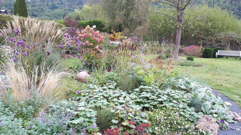Hier klecksen zu unserer täglichen Freude Felsenbirne, Goldliguster, Blaubeere, Herbstanemone und Geranium ein bisschen Farbe vor die Hainbuche.