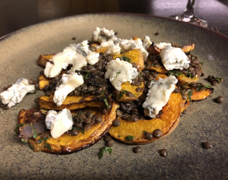Heute gab es gerösteten Butternuss Kürbis mit Linsen und Gorgonzola. An Gewürzen gab es Salbei der mit dem Kürbis mit geröstetet wurde und Knoblauch , Petersilie, Estragon, Minze und Zitronenabrieb und Saft.