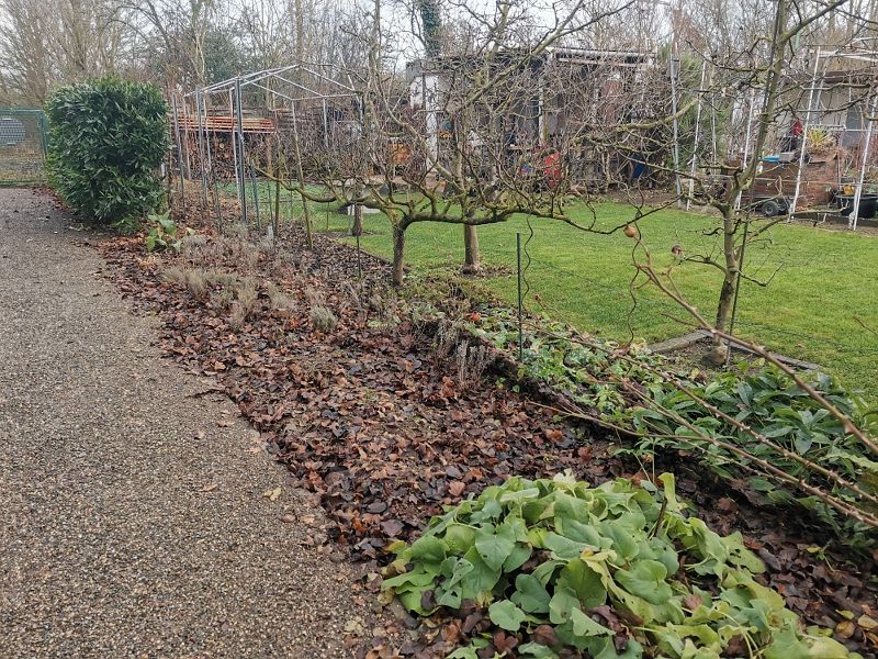 Den Bereich um den Spalierbaum würde ich flach halten, finde den schön zum Anschauen.