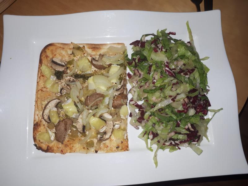 Flammkuchen mit Wirsing, Champignons, Zwiebeln und Camembert