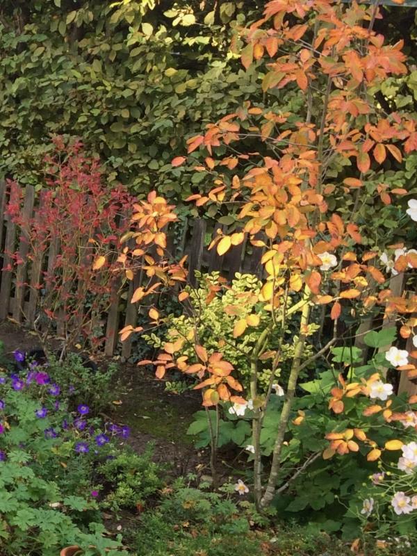 Hier klecksen zu unserer täglichen Freude Felsenbirne, Goldliguster, Blaubeere, Herbstanemone und Geranium ein bisschen Farbe vor die Hainbuche.